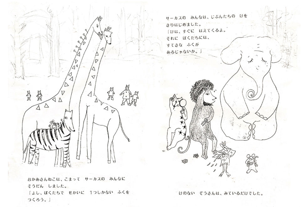 動物たちの特徴を生かして、みんなで協力して服を作り上げました。最後に何も役に立たずにがっかりしていた象さんに、象さんの特徴を生かして服の仕上げをしてもらいました。