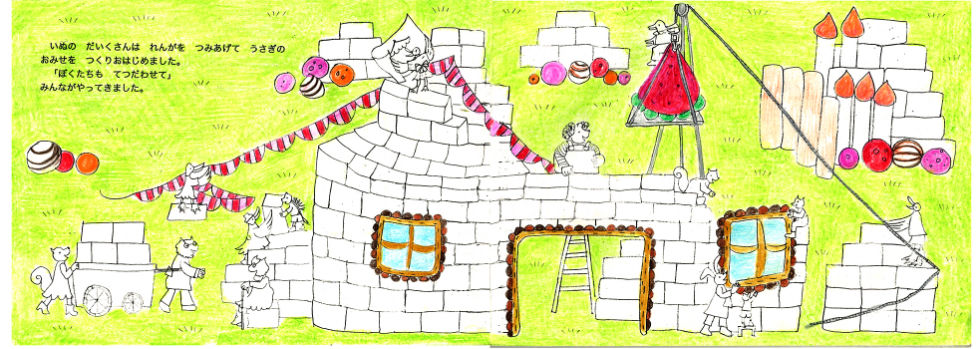 犬の大工さんは注文に応じて、ケーキの形のすてきな家を建てていきます。