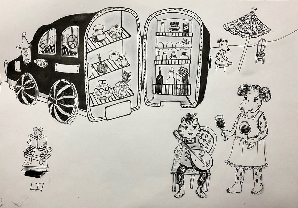 自費出版した「メロン氏の一日」の一場面をリトグラフで制作しました。